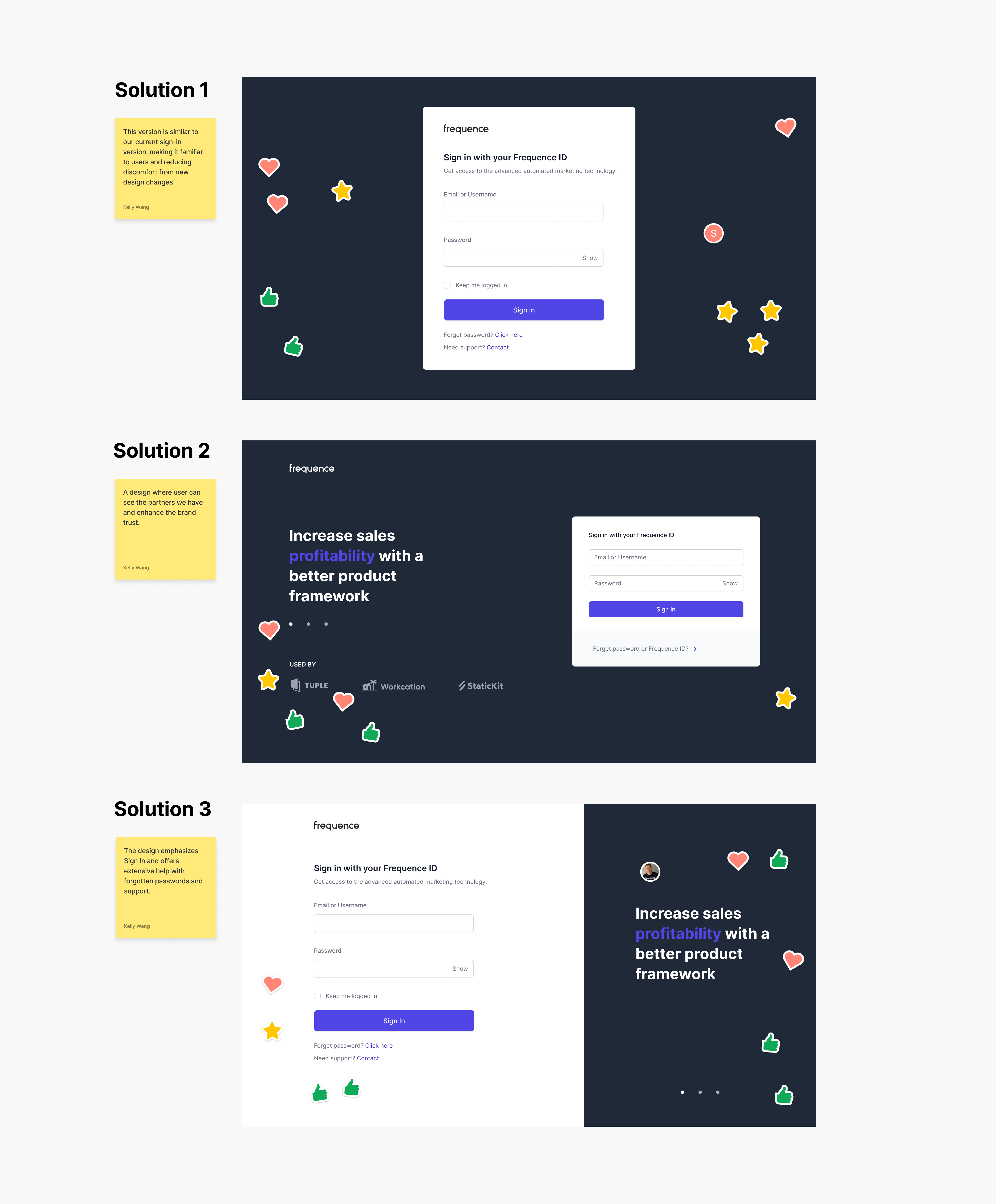 Solution 1 is similar to original sign-in version, making it familiar to users and reducing discomfort from new design changes. Solution 2 is a design where user can see the partners we have and can enhance the brand trust. Solution 3 emphasizes the Sign In and offers extensive help with forgotten passwords and support.